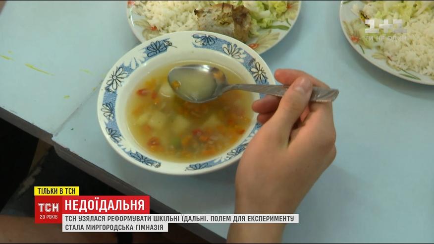 ТСН вычислила стоимость такого обеда до копейки. Для этого провела эксперимент на настоящем школьном пищеблоке - в Миргороде. Шеф-повар столичного ресторана приготовил там обед из продуктов, которые ежедневно используют в школьных столовых.