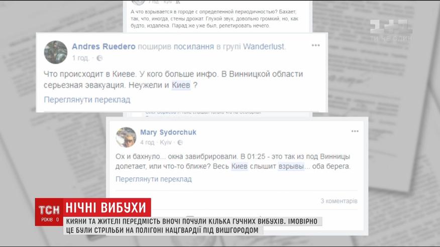 Около 10 вечера киевляне и жители пригорода услышали несколько глухих мощных разрывов. Из Вышгорода даже сообщали, что вздрагивали дома и бренчало стекла в окнах. Никаких вспышек никто не заметил. После полуночи взрывы прекратились. На прошлой неделе Вышгородской райадминистрации сообщила о плановых стрельбах на полигоне Нацгвардии, но по расписанию они должны были закончиться до 18 часов.