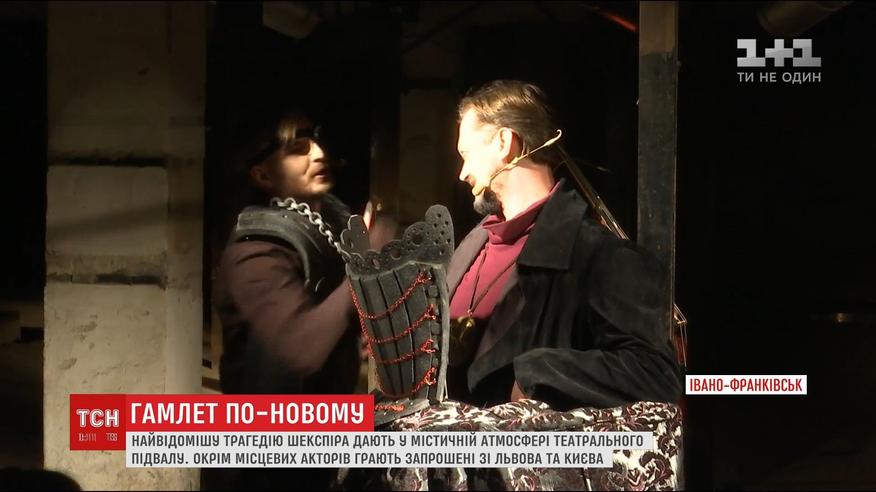 Среди реквизита смартфоны, актрисы в мини и брюках, а принц датский прямо на сцене жарит мясо. И все это происходит в подвале, в машинном отделении. В первом ряду - Юрий Андрухович, ведь на сцене "Гамлет" именно в его переводе.