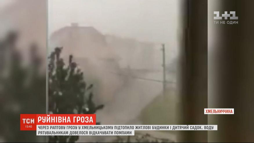 Внезапная гроза, которая сопровождалась шквальным ветром, наделала беды в Хмельницком. За считанные минуты городские улицы превратились в реки, воды местами было выше колен. Подтопило частные дома и детский сад. Воду оттуда спасатели откачивали насосами. Никто не пострадал. Также потоком дождевой воды залило несколько домов и подвалов в селе Вився. Убытки еще подсчитывают.