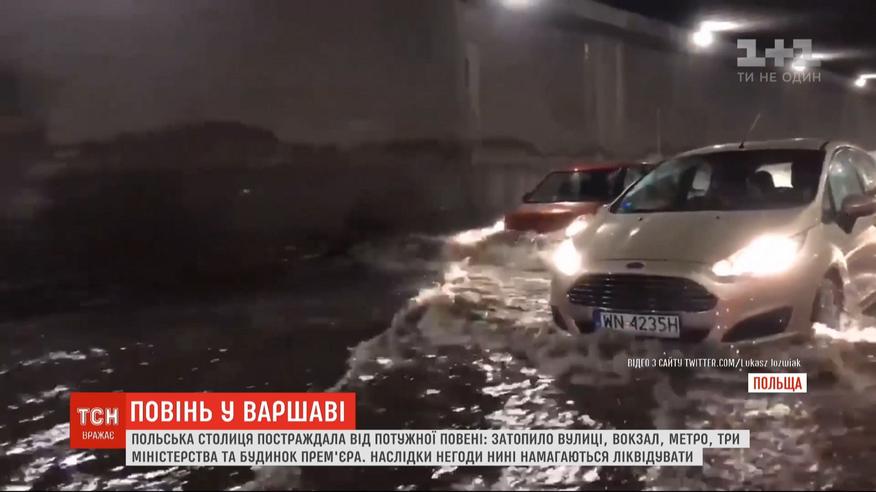 Варшава пострадала от удивительно сильного ливня - высокая вода затопила улицы, вокзал, несколько станций метро, три министерства и дом премьера страны. В мэрии говорят - наводнения таких масштабов не видели менее двух лет. По подсчетам чиновников, на один квадратный метр площади в Варшаве вылилось не менее 40 литров воды. Спасательные службы получили более семи сотен вызовов. Сейчас ситуация под контролем, с затопленных зданий откачивают воду и моют их.