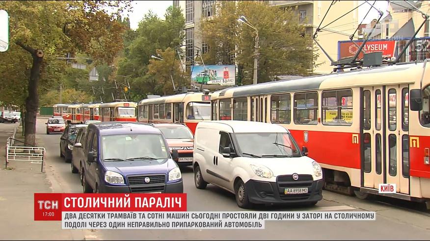 Неправильно припаркованный автомобиль парализовал движение на столичном Подоле