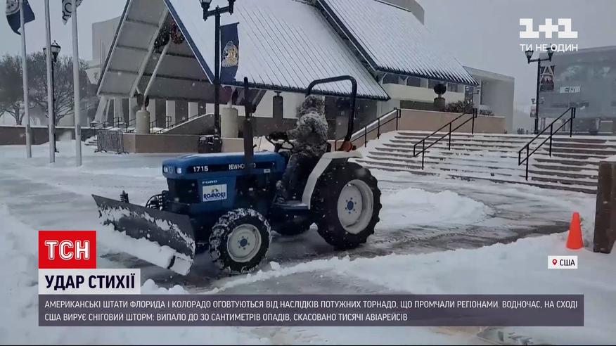 Двойная непогода в Соединенных Штатах: несколькими регионами промчались торнадо, а еще несколько – замело снегом. Штаты Флорида и Колорадо приходят в себя от воздушных вихрей - торнадо разрушили десятки домов и повредили более полусотни. Травмы получили по меньшей мере четыре человека. Еще 15 тысяч американцев в этих штатах остались без света. Между тем, к востоку страны обрушился мощный зимний шторм: кое-где выпало до 30-ти сантиметров снега.