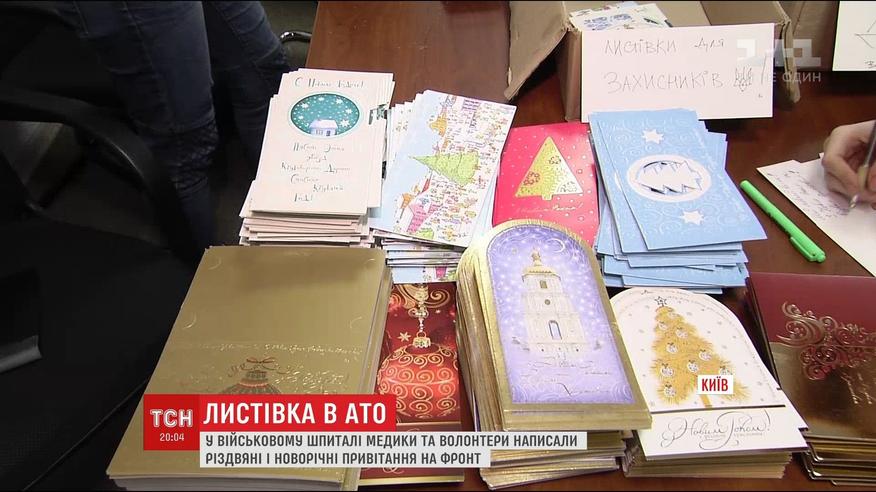 Столичные медики, раненые бойцы и школьники написали письма военным и детям в прифронтовые города. Открытки волонтеры получили в качестве благотворительной помощи от производителя. Часть отдали в школу, чтобы их подписали дети. Поздравлений уже собралось несколько тысяч. Акцию проводят во второй раз. Говорят, в прошлом году открыток собрали значительно меньше, зато убедились, что для адресатов это очень приятно.