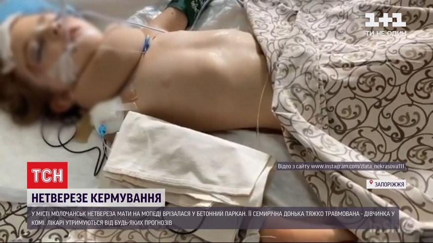 Вывести из комы 7-летнюю девочку пытаются запорожские медики. Девочка тяжело травмировалась во время ДТП. Ее нетрезвая мать везла на мопеде двух детей и врезалась в бетонный забор. Старшая дочь отделалась ушибами. Младшую с разбитой головой забрали в больницу в критическом состоянии. Ей уже сделали одну операцию и подключили к аппарату искусственной вентиляции легких. В крови матери медики обнаружили 2,2 промилле алкоголя - это равно бутылке водки.