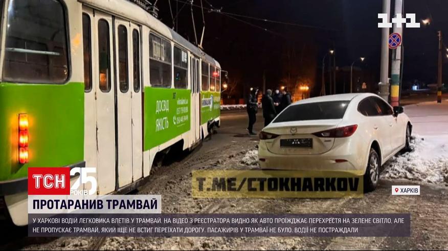 В Харькове водитель легковушки влетел в трамвай. На видео с регистратора видно, как авто мчится к перекрестку, проезжает светофор уже на зеленый свет, но не пропускает еще не успевший переехать дорогу трамвай. По всей видимости, водитель автомобиля пытался объехать электротранспорт по обочинам, однако, не рассчитал скорость и врезался в него. В момент столкновения пассажиров в трамвае не было, водители обоих транспортных средств не пострадали.