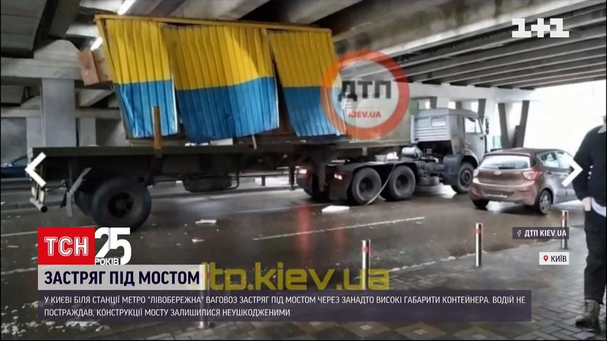 Новости Киева: возле станции метро "Левобережная" под мостом застрял грузовик
