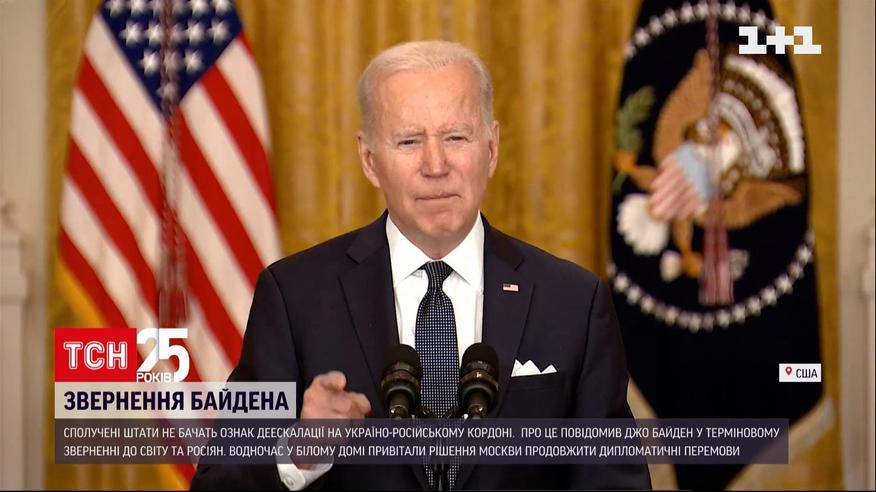 Вторжение остается возможным - об этом заявил президент США в специальном обращении по Украине. По его данным, несмотря на заявления Кремля о частичном отводе войск и готовности к переговорам, на границе с Украиной Россия оставляет 150 тысяч военных.