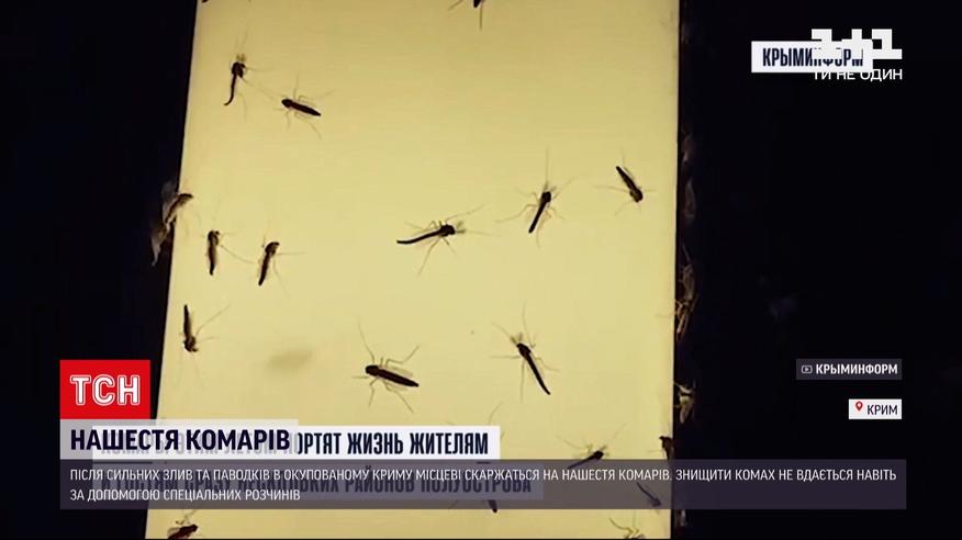 Нашествие комаров в оккупированном Крыму. После сильных ливней и паводков на полуостров явилась другая стихия - все заполонили насекомые. Местные пытаются распылять дезинфекционные растворы в воздухе с надеждой, что хотя бы это поможет. И жалуются - туристический сезон этим летом, похоже, сорван. Сначала отдыхающих напугали паводки, теперь еще и комары. Из-за ливней под водой на оккупированном полуострове оказалось сразу несколько городов.