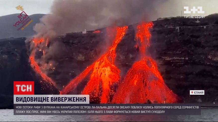 Зрелищное извержение – новые потоки лавы из вулкана на Канарском острове Ла Пальма достигли океана. Раскаленная скамья стекает вблизи некогда популярного среди серфингистов пляжа Лос Гиррос – ныне он весь покрыт пеплом, и возле него со скамьи формируется новое выступление суши. Скамья тянет за собой гигантские валуны, летящие в воду. За извержением наблюдают с помощью дронов.