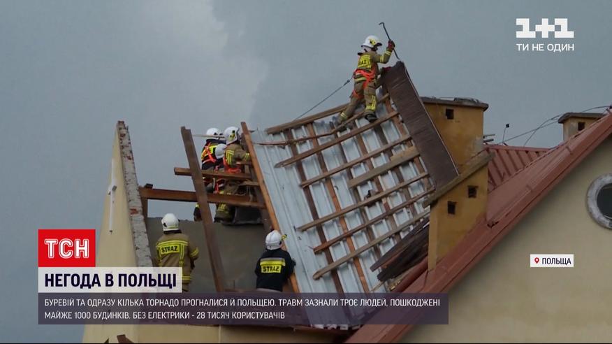 Ураган и сразу несколько торнадо прогналися и юго-восточной Польшей. Травмы получили три человека, повреждены около тысячи домов - в основном это сорванные крыши. Также много поломанных и выкорчеванных деревьев. А многие поселки затопило из-за обильных дождей. Без электричества остаются 28 тысяч пользователей. Синоптики предупреждают: в ближайшие дни торнадо могут повториться. И призывают людей быть бдительными.