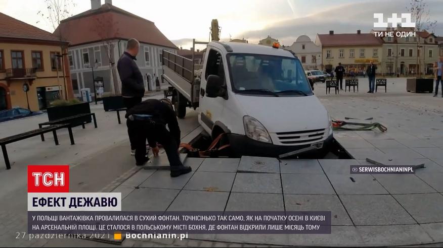 В Польше грузовик провалился в сухой фонтан. В польском городке Бохня фонтан открыли всего месяц назад. Грузовик въехал в него и провалился. Его два часа пытались достать экскаватор. Однако, в конце концов, пришлось вызвать автокран из соседнего города.