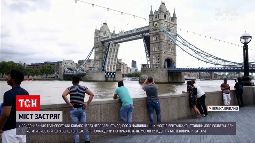 Транспортный коллапс известной переправой Великобритании - в Лондоне на 12 часов остановилось движение Тауэрского моста. Его развели, чтобы по Темзе проплыл высокий деревянный корабль, а затем мост застрял. Починить неисправность специалисты не могли длительное время. Поэтому на мост не пускали ни автомобили, ни пешеходов. А на прилегающих улицах возникли большие пробки.