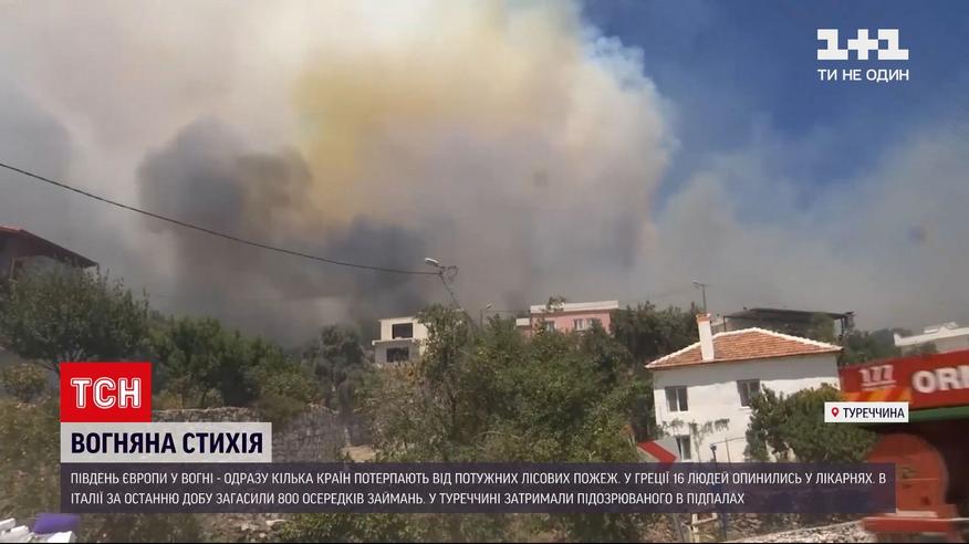 Юг Европы в огне. В Греции за последние сутки вспыхнули 50 новых пожаров. В больницах 16 человек, уничтожены десятки зданий. Перекрыта трасса в направлении Афин. Работу спасателей затрудняет ветер и 40-градусная жара. Более 800 источников возгораний за сутки потушили спасатели в Италии. Над Сицилией поднимаются столбы дыма. А в Турции задержали первого подозреваемого в поджогах, из-за которых начались пожары - ответственность за них взяла на себя одна из курдских террористических организаций.