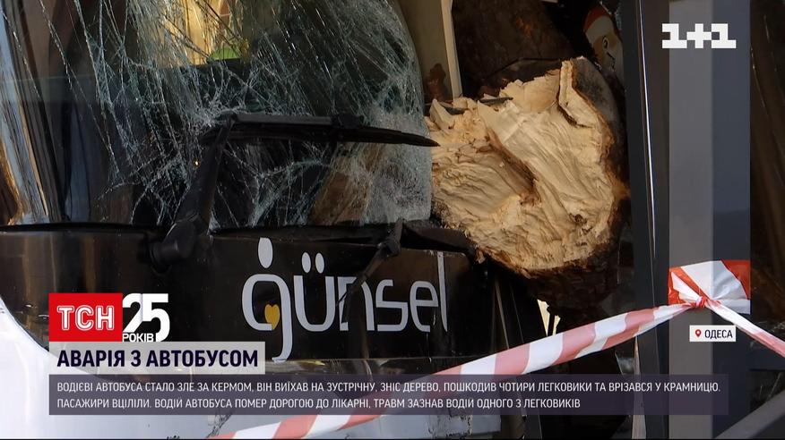 Снес дерево, задел несколько легковушек, а потом врезался в магазин. В Одессе двухуровневый рейсовый автобус на несколько часов остановил движение по улице. Один человек погиб. еще одна получила травмы. Водитель внезапно выехал на встречную – в салоне в это время были пассажиры. Поочередно бус ударил четыре легковушки и, не останавливаясь, сбил дерево. Остановила его только витрина лавки, в которую он врезался. Пассажиры автобуса рассказывают: водителю стало плохо за рулем, он потерял сознание, после ДТП его забрала скорая.