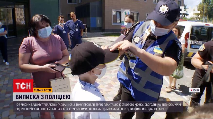 С полицейскими собаками, двумя экипажами полиции и звуками сирены выписывали из столичного "Охматдета" 10-летнего Вадима Табаркевича. С диагнозом лейкемия мальчик попал в больницу еще в ноябре. Два месяца назад ему сделали трансплантацию костного мозга, донором стал отец. Выйти наконец из палаты на улицу, а еще увидеть настоящего служебного пса - то, о чем Вадик всего мечтал все это время.