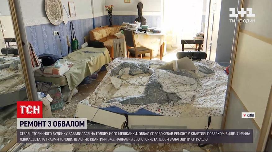 Потолок исторического здания в столице рухнул на голову его жительницы. А все из-за ремонта в квартире этажом выше. 71-летняя женщина получила травмы. В доме, который ремонтируют, снесли все перегородки, оставили только опорные стены. В комнатах соседей пошли трещины. Но владельцы пообещали все уладить, когда доремонтують. Их представители утверждают - имеют документы на перестройку и предполагают, что проблема не в ремонте, а в состоянии дома.