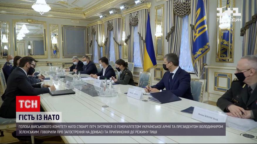 Председатель Военного комитета НАТО прибыл в Украину. Стюарт Питч встретился с генералитетом украинской армии и президентом Зеленским. Главная тема разговоров - обострение на Донбассе и прекращения действия режима "тишины". Главнокомандующий вооруженных сил Украины Руслан Хомчак сообщил, что говорили с гостем о реформировании армии и приближения ее к стандартам НАТО. А Стюарт Питч заверил руководство государства и военных в неизменной поддержке Украины Североатлантическим Альянсом.