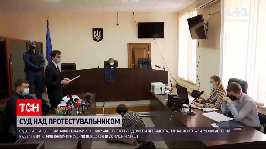 Из-за файера - под круглосуточный домашний арест. Суд накануне избрал меру пресечения уже седьмому участнику акции протеста под Офисом президента, во время которого были расписаны стены офиса. Сергея Филимонова обвиняют в том, что он зажег сигнальный дым во время акции протеста. Парень возмущается, потому наоборот пытался помешать столкновениям во время акции.