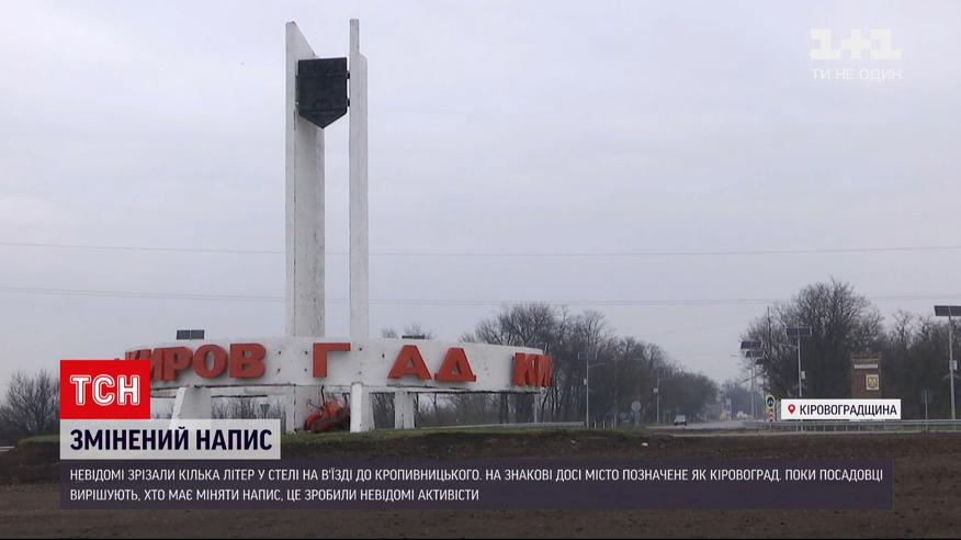 "Киров гад". Стелла с такой надписью отныне будет встречать путешествующих на въезде в Кропивницкий со стороны Николаева. На указателе на объездном пути неизвестные в слове "Кировоград" срезали две буквы и таким необычным способом декоммунизировали стелу. Город уже почти 5 лет носит название Кропивницкий, однако надпись на въезде до сих пор не изменили. Активисты несколько раз обращались с этим вопросом к мэрии, и бесполезно. И вот метровые буквы кто-то тщательно снял газовым резаком.