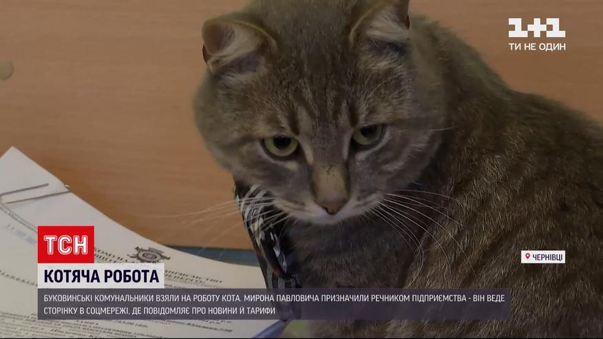 Пиар-ход от буковинский коммунальщиков. Работники тамошнего теплокоммунэнерго приютили бездомного кота, и впоследствии заявили - взяли четвероногого на работу. Зовут кота Мирон Павлович. Он ежедневно свободно ходит офисами, проверяет котельные, спит на столах и копается в кипах документов. Сотрудники шутят, как вылезет на судебные дела - они становятся выигрышными.