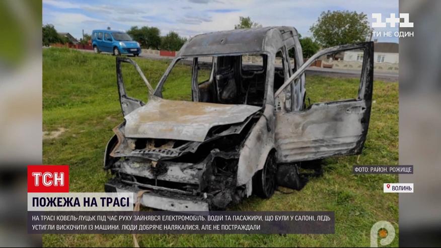 На трассе "Ковель-Луцк" во время движения загорелся электромобиль. По словам очевидцев, авто загорелось внезапно и за считанные минуты выгорело дотла. Водитель и пассажиры, находившиеся в салоне, едва успели выскочить из горящей машины - сильно испугались, но не пострадали. Автомобиль потушили спасатели.