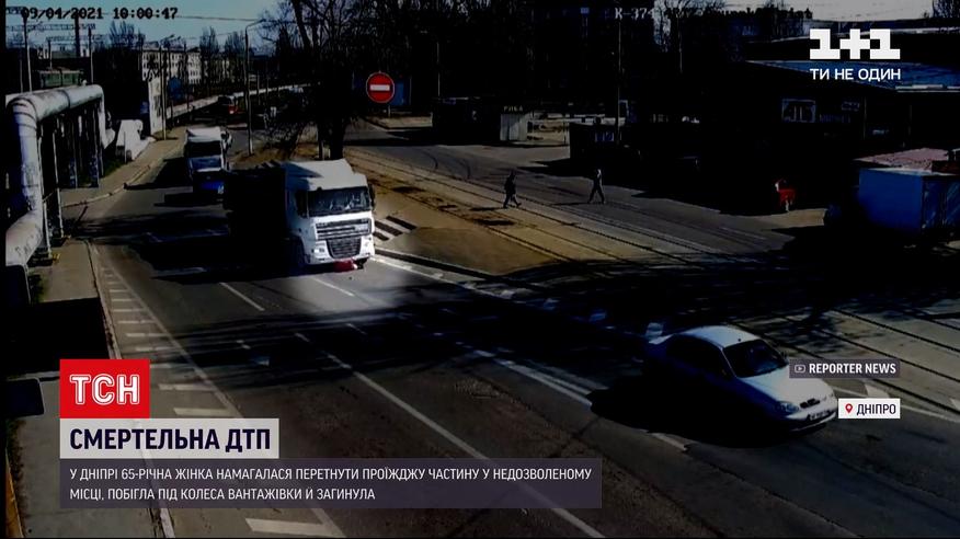 Бежала прямо под колеса. В Днепре пенсионерка погибла, когда пыталась сократить дорогу в магазин. Момент аварии зафиксировали камеры видеонаблюдения. Видно, как грузовик стоит перед светофором, а только ему загорается зеленый - медленно начинает движение. В этот момент женщина пытается пересечь дорогу и попадает под колеса грузовика. Водитель фуры ее не видел, поэтому продолжил движение.