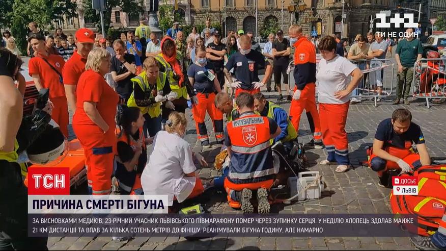 Внезапная остановка сердца. Медики назвали причину смерти 23-летнего участника львовского полумарафона. В воскресенье парень одолел почти 21 километр дистанции. До финиша ему не хватило всего 200 метров. Бегун внезапно упал. Почти час медики пытались его реанимировать, но напрасно. В городском совете говорят, участник был любителем и это не первый его полумарафон. Медики добавляют - парень бежал с высоким давлением, а еще организм был обезвожен. И не исключают, что перед забегом он употреблял энергетический напиток, который глушил сигналы организма о проблемах со здоровьем.