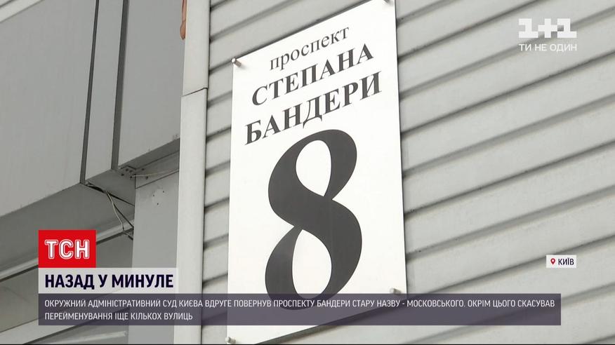 Московский или Бандеры. Столичные власти совместно с Институтом национальной памяти обжалуют решение Окружного админсуда Киева о переименовании улиц. Речь идет о возвращении проспекта Бандере и еще четырем улицам старых названий. Накануне Окружной административный суд Киева во второй раз признал, что переименование незаконно. Сегодня под стенами суда митинговали националисты. Требовали от президента инициировать роспуск этого учреждения.