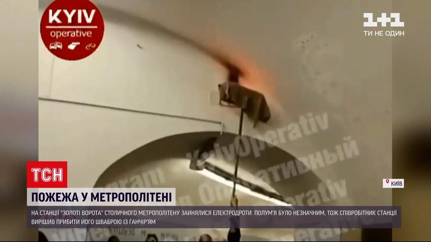 Шваброй и тряпкой тушить пожар: утром в столичном метро на станции "Золотые ворота" пассажиры сняли, как под потолком загорелись электропровода. Пока полицейский и некоторые пассажиры пытались сдержать толпу людей, работник метрополитена пришел со шваброй и начал сбивать пламя. Как это было - смотрите далее.