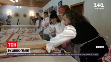 200-метровый рушник по технологии IX века в изготавливают в Чернигове. Представить его в городе хотят на День Конституции. А на День Независимости планируют развернуть и в Киеве. К работе привлечены представители всех территориальных общин Черниговской области, а также десяти местных нацменьшинств. Орнамент на полотенце наносят с помощью штампов с липы. Их красят, прикладывают к ткани, а затем бьют по ним молотком. Именно такую технологию и использовали более 10 веков назад.