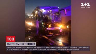 Смертельное ДТП в Одесской области. Около 4:00 утра вблизи села Знаменка на Одесской трассе рейсовый автобус, следовавший из Киева в Кишинев, не разминулся с зерновозом. В салоне, предварительно, находилось 20 пассажиров. Один человек погиб. По меньшей мере четверо пассажиров, среди которых, по информации спасателей, был и ребенок, попали в больницу.
