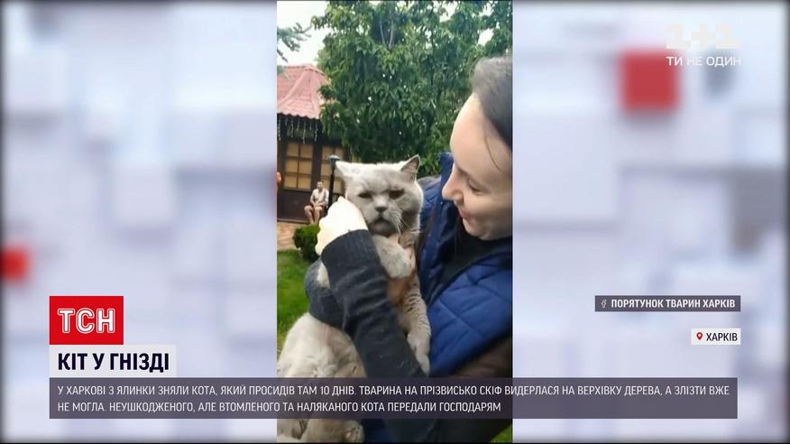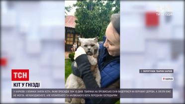 Кот в гнезде. В Харькове сняли с елки кота, который просидел там аж 10 дней. Усач взобрался на верхушку, а слезть уже не смог. А чтобы ждать спасения удобнее, сел в птичьем гнезде. Сначала хозяева Скифа, так его зовут, пытались кота с дерева выманить - но напрасно. Тогда за дело взялись волонтеры.