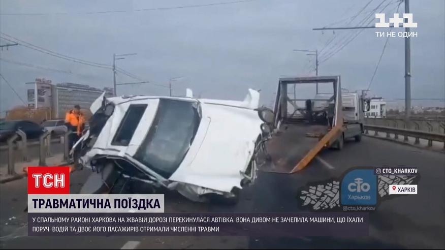 Разбитая легковушка и трое пострадавших. Такие последствия аварии в спальном районе Харькова. Там на оживленном проспекте водитель Мерседеса не справился с управлением и влетел в отбойник. Момент попал на регистратор попутного авто. От сильного удара неуправляемая иномарка перевернулась на крышу. Лишь чудом она не задела другие машины, которые ехали рядом. 35-летний водитель и двое его пассажиров получили многочисленные травмы.