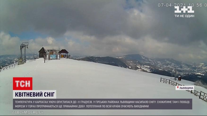 До -11 опустилась ночью температура в Карпатах. В частности, в горных районах Львовской области еще насыпало снега. В высокогорном Турковском районе - аж до 14 сантиметров. Синоптики прогнозируют, что будет идти снег там и сегодня после обеда. Впрочем уверяют - такое похолодание не аномалия для горных районов в апреле. Морозы в Карпатах продержатся еще как минимум сутки. А потепление ожидают на выходные, как и по всей стране.