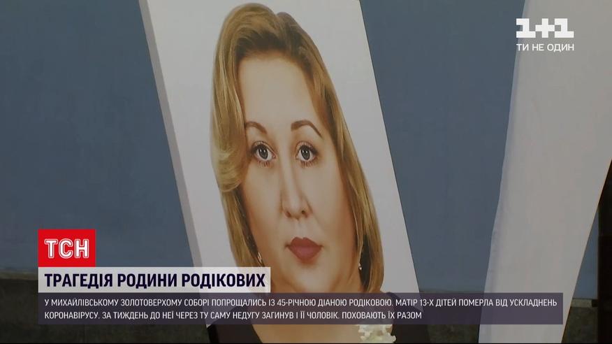 Прощание с мамой тринадцати. В Михайловском Златоверхом соборе отпели 45-летнюю Диану Родикову. Она умерла накануне от осложнений коронавируса - через неделю после того, как эту болезнь не пережил ее муж Владимир. 7 лет назад Родиковы переехали в Киевскую область с оккупированной Макеевки вместе с детьми. Супруги имели 5 родных и 8 усыновленных детей. Опекуншей несовершеннолетних братьев и сестер вызвалась быть их старшая сестра. Больше о коронавирусе в Украине