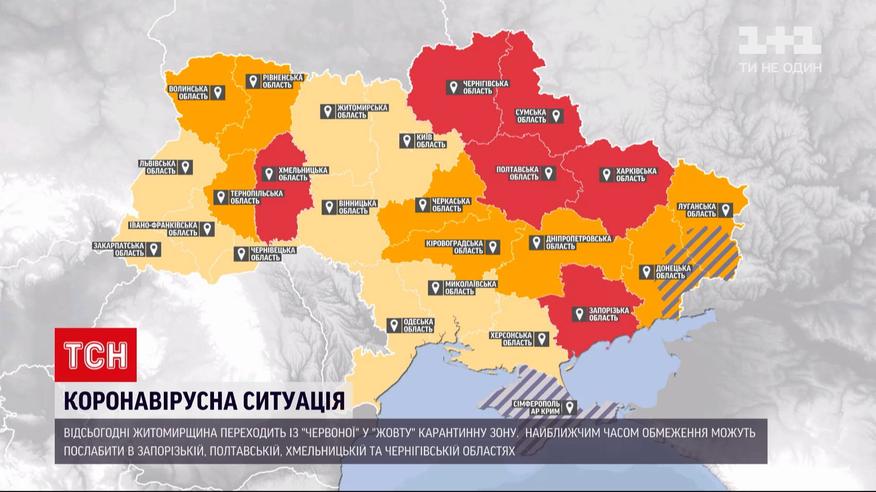 Эпидемиологическая карта Украины - уже менее багровая. Житомирская область больше не "красная", регион переходит сразу в "желтую" карантинную зону. "Укрзализныца" восстанавливает железнодорожное сообщение с Житомирской областью. Она была последним регионом, где действовали транспортные ограничения, и теперь поезда будут курсировать по всей Украине. В "красной" зоне остаются 6 областей.