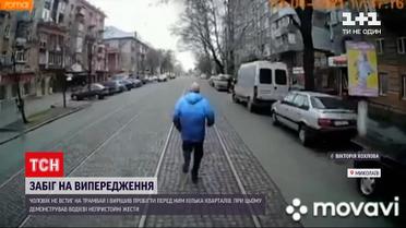 Забег на опережение. В Николаеве мужчина не успел на трамвай и вместо того, чтобы ждать следующего, решил электротранспорт обогнать. Гонки снял авторегистратор. На кадрах мужчина сначала бежит к трамваю, но не успевает. Тогда сломя голову обгоняет его, выбегает впереди и ругает водителя неприлично жестикулируя. После чего - продолжает бежать впереди, заставляя водителя ехать медленнее.