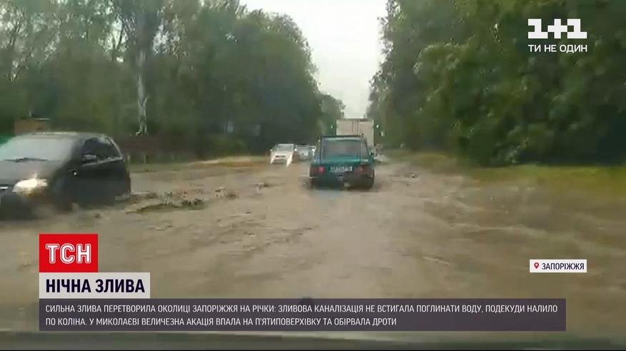 Затоплен Запорожье. Ночной ливень превратил окрестности города в реки. Ливневки не могли справиться с таким количеством осадков: за несколько часов налило не по колено. На выезде из областного центра образовались гигантские пробки: машины не могли преодолеть водную преграду. А в Николаеве сильный ливень повалил огромную акацию: дерево упало прямо на пятиэтажку и оборвало провода.