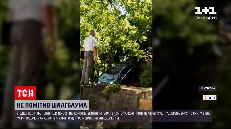 Полетел со склона в сторону моря. В Одессе водитель "БМВ" на полной скорости перескочил бетонный парапет, снес металлический забор и полетел через кусты и деревья вниз. Машина пролетела два десятка метров с горы, а потом врезалась в берегоукрепительных конструкцию. Пассажирка авто попала в больницу, водитель чудом остался невредимым.