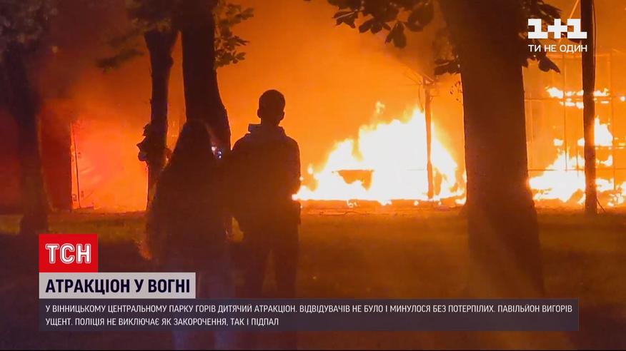 Пожар в центре города. В Виннице в центральном парке горел детский аттракцион. Загорелось поздно вечером. Посетителей не было и обошлось без пострадавших. Столб черного дыма был виден за несколько кварталов. Огонь чуть не перекинулся на другие аттракционы и минизоопарк в 10 метрах от эпицентра. Через полчаса пожар потушили. Павильон выгорел дотла. Причины пожара устанавливает полиция. Не исключают как короткое замыкание, так и поджог.