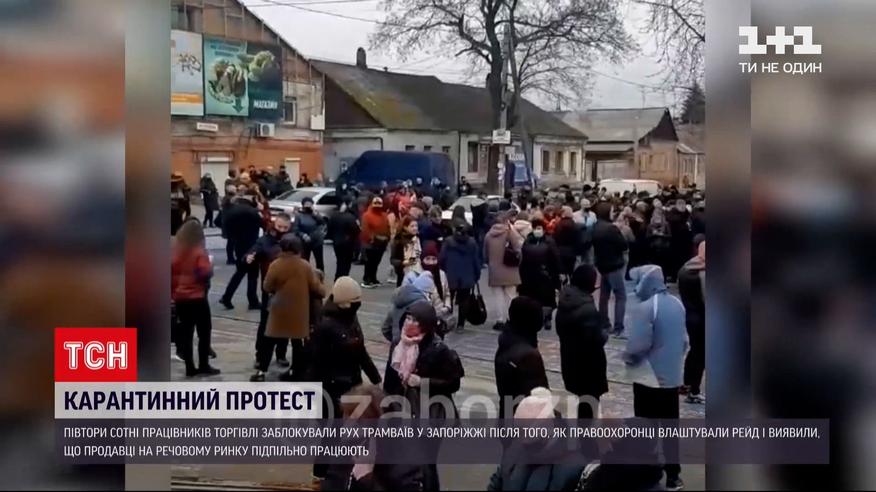 Столкновения с правоохранителями и остановка транспорта. В Запорожье торговцы вышли на трамвайные пути и заблокировали движение трамваев. Полторы сотни человек требовали отмены правил карантина, действующих с субботы. Сейчас в Запорожье работают только продовольственные рынки. Митинг возник у входа на Центральный вещевой рынок.