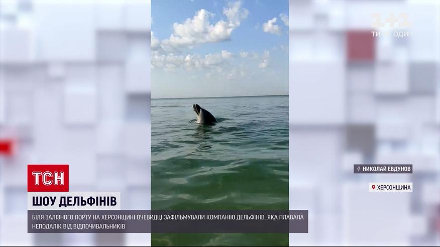 У Железного Порта в Херсонской области очевидцы сняли шоу дельфинов. Отдыхающие говорят, увидеть игривых животных на черноморском побережье обычно можно утром. Приплывает компания красавцев просто к берегу на мель, где купаются люди. Дельфины плавают рядом и прыгают, показывая черные спины.