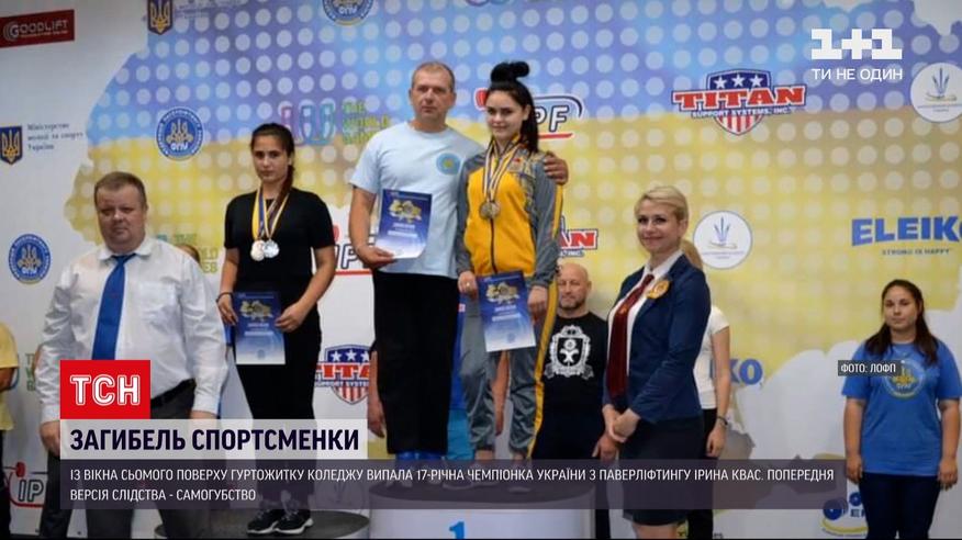 Гибель спортсменки. Во Львове из окна общежития выпала чемпионка Украины по пауэрлифтингу, Ирина Квас. Ей было 17 лет, училась на втором курсе в колледже на факультете правоведение. Накануне утром Ирина выпрыгнула из окна седьмого этажа общежития. А перед тем закрылась в комнате изнутри. Смерть наступила мгновенно, девушка упала на место, где лежала щебенка. Студенты общежития, где она жила, рассказывают: перед гибелью девушка сильно поссорилась с парнем.