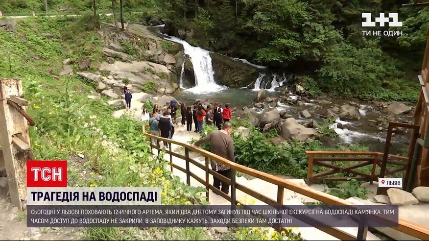 Сегодня во Львове похоронят 12-летнего Артема, погибшего во время школьной экскурсии на водопаде Каменка. По факту гибели полиция открыла уголовное производство. Несмотря на трагедию, доступ к водопаду не закрыли. Там накануне было несколько школьных экскурсий. Комиссия по вопросам чрезвычайных ситуаций решила поставить дополнительные столбцы и предупредительные таблички на водопаде, а педагогов обязали провести дополнительные инструктажи по технике безопасности.