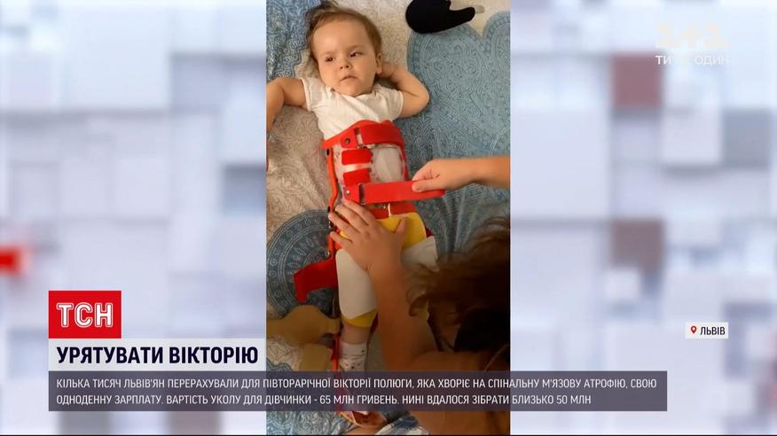 5 миллионов гривен только за день собрали люди на спасение маленькой Виктории. Накануне во Львове объявили "День для Виктории Полюги". Несколько тысяч горожан перечислили девочке свою однодневную зарплату. Полуторагодовалая Вика страдает спинальной мышечной атрофей, от которой постепенно слабеют все мышцы. Девочка нуждается самого дорогого в мире укола, который надо сделать до того, как ребенку исполнится два года. Его стоимость – 65 миллионов гривен. Сбор средств для спасения Вики начался весной. Чтобы Виктория жила полноценной жизнью, осталось дособирать 15 с половиной миллионов гривен.