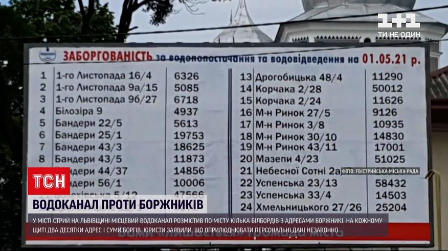 Пристыдить должников. В городе Стрый во Львовской области местный водоканал разместил по городу несколько билбордов с адресами тех, кто не заплатил за воду. На каждом щите два десятка адресов и суммы долгов. Они колеблются от шести до пятидесяти восьми тысяч гривен. И как уже посчитали в Стрийводоканали, общий долг жителей перед предприятием превысил полмиллиона гривен.