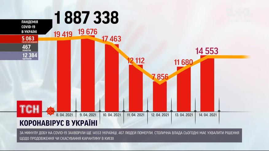 Стабильно высокий показатель смертности. За прошедшие сутки от осложнений, вызваных коронавирусом, умерли 467 человек. Имеем снова больше новых больных, чем тех, кто выздоровел. Положительный результат теста получили 14,5 тысяч украинцев. При этом вышли из болезни почти на две тысячи человек меньше. Больше всего новых случаев зафиксировали в Киеве. Это почти 1,5 тысячи. Но несмотря на это столица вскоре может покинуть "красную" зону.