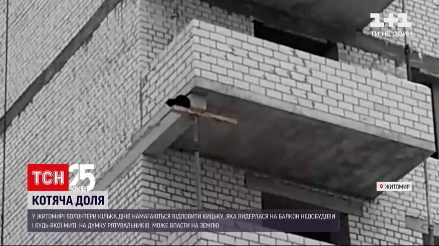 В Житомире волонтеры несколько дней пытаются спасти кошку. Животное взобралось на один из самых высоких этажей недостроя и в любой момент, уверены его спасательницы, может слететь вниз. Вот эти кадры разместили в соцсетях. Говорят, чтобы четырехлапу отловили и спустили на землю - обращались ко всем специальным службам города. В конце концов, сами попали на стройплощадку, несколько часов искали черную кошку, впрочем, вышли с пустыми руками.