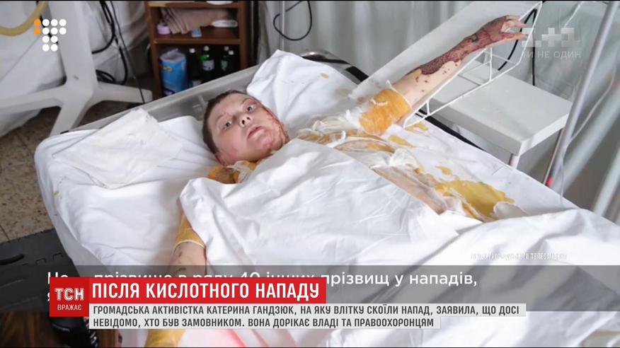 Советница городского головы Херсона Екатерина Гандзюк, на которую летом совершили нападение, заявила, что пока не знает, кто заказчик. В конце июля у ее дома неизвестный злоумышленник вышел из кустов и плеснул ей в лицо около литра концентрированной серной кислоты. Девушка получила ожоги 30% кожи. Подозреваемого задержали через несколько дней после покушения, впрочем, уже через несколько недель отпустили.